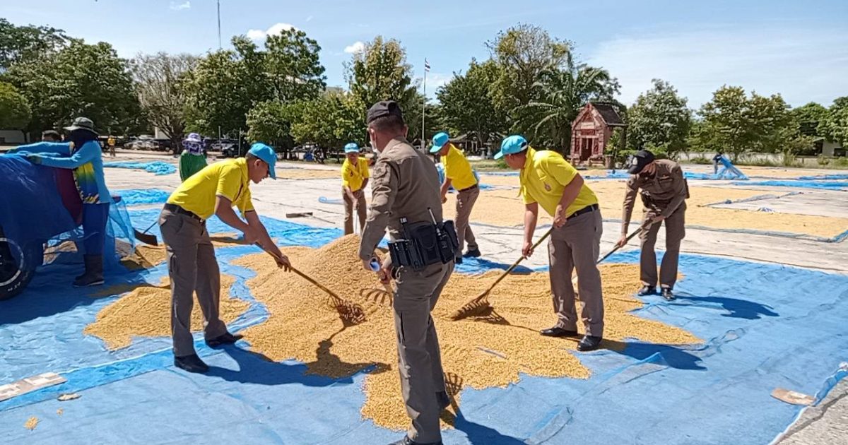 ตำรวจจิตอาสา พัฒนา ช่วยเหลือชาวบ้านตากข้าว บริเวณลานปูนหน้าที่ว่าการอำเภอแกดำ